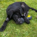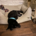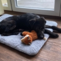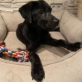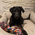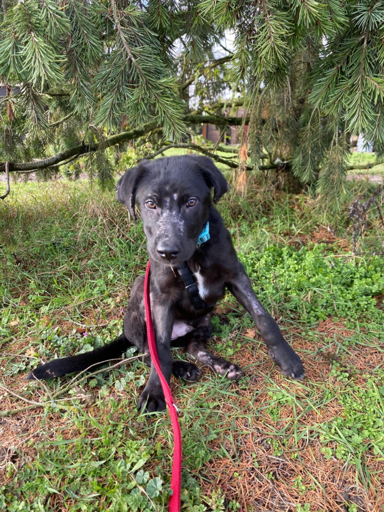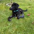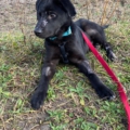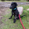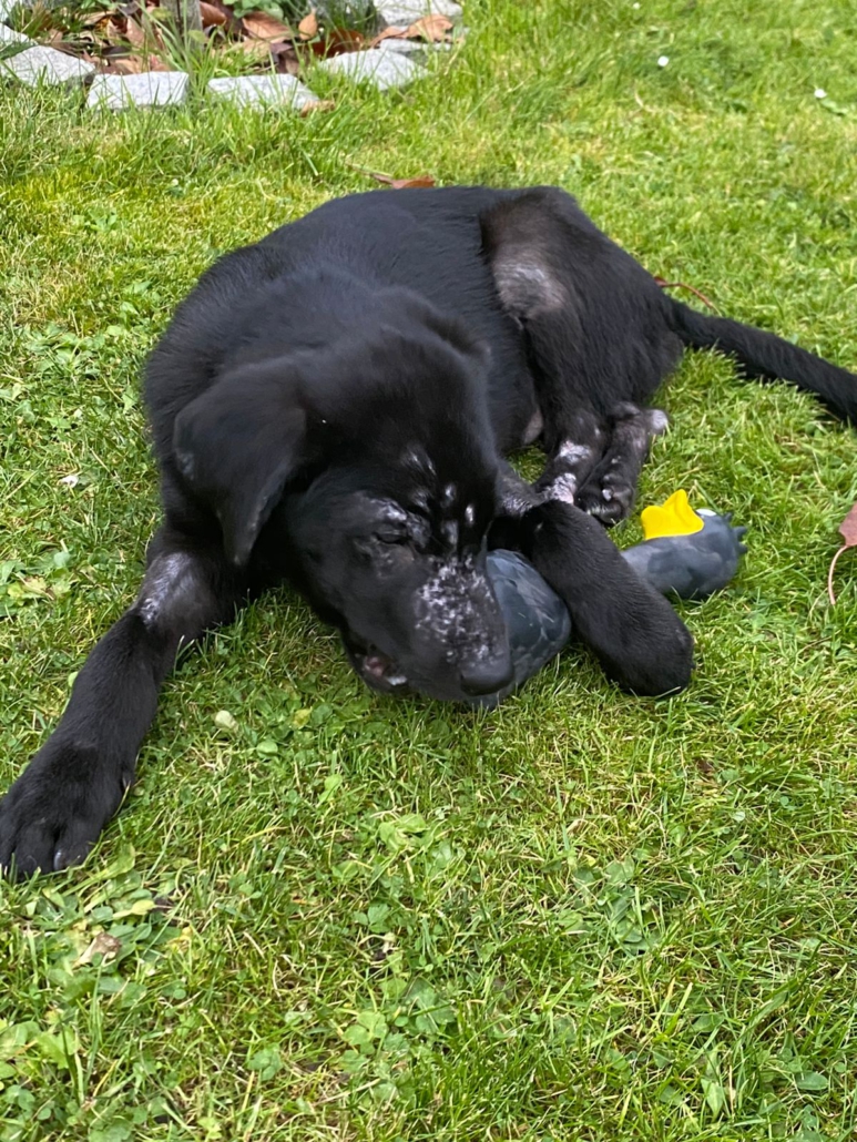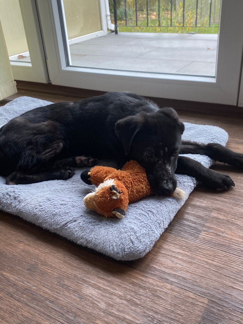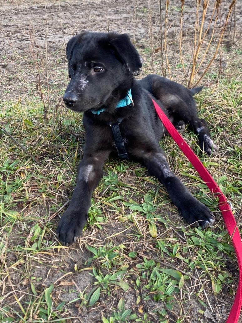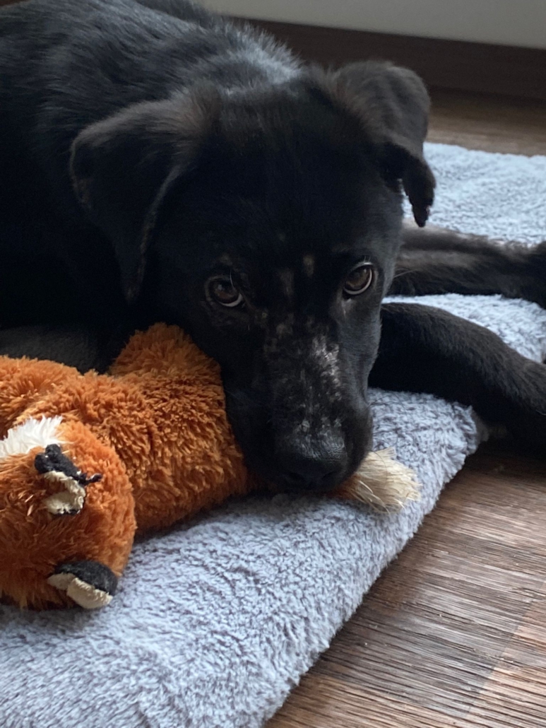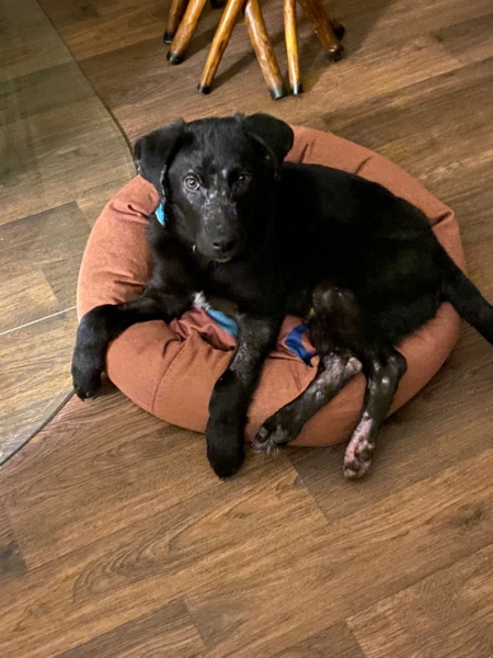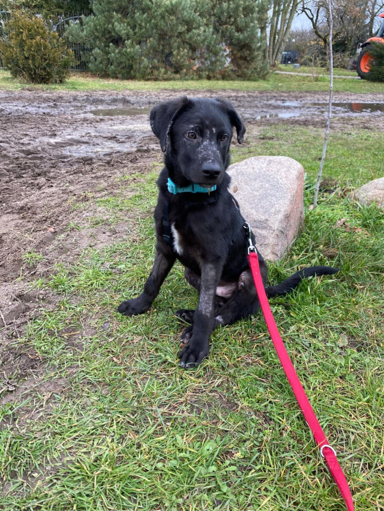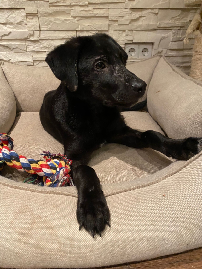 Die Elterntiere sind unbekannt, doch optisch erinnert Benni mit seinem samtigen tiefschwarzen Fell und seiner Statur an einen Labrador-Mix. Noch sind Spuren der Vergangenheit sichtbar aber das Fell wächst nach.