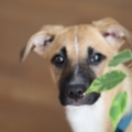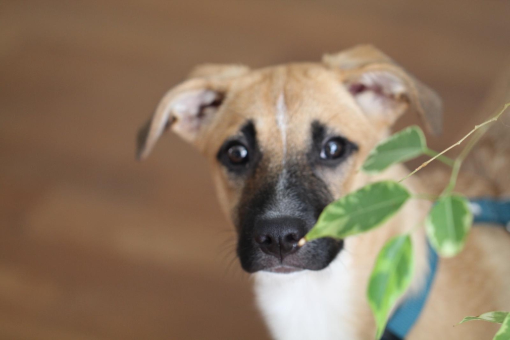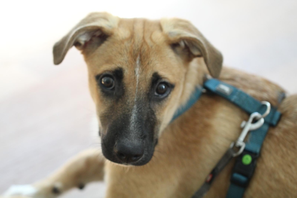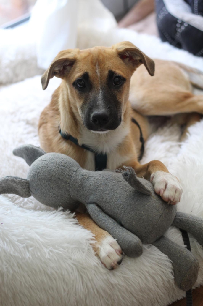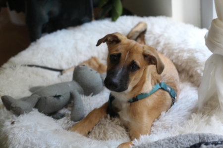 Die Elterntiere sind uns unbekannt, aber rein optisch wirkt unser Schützling wie ein Black Mouth Cur Mix.