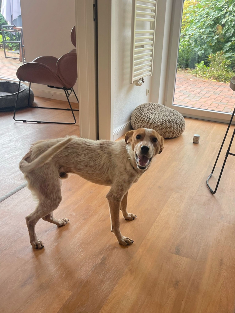 Er ist am 24.9.24 geboren (durch einen Tierarzt geschätzt), hat eine Schulterhöhe von 52 cm und wiegt 15 kg. Zur Zeit wird er etwas aufgepäppelt, da noch zu dünn ist.